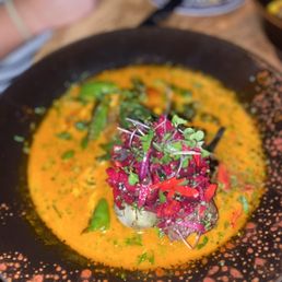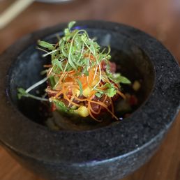 Dining here is an epic culinary experience for all true foodies. Amateurs and purists need not apply. This is a great place for those who love both Asian and Mexican food. It would also be a great place for a date night. The umami flavors from both cultures are wonderfully incorporated into many of the dishes and each dish is served with an eye catching presentation. The ambiance is relaxed and there is dimmed lighting at night for dinner. The restaurant has a refreshing contemporary look on the inside. I love that they planted an actual tree in the middle of the restaurant, almost making it feel like you're dining outside. The service is excellent and our server was attentive to making note of my dietary restrictions and modifications were made. The steak did take quite a while but they were also very busy for a Monday night. Be forewarned that the menu is a bit pricey here so it is not a place for all. I will probably only be back for another special occasion.